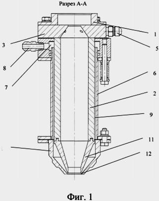 Установка содержит электродуговой плазмотрон (на фигурах не показан), связанный резьбовым соединением с плазменным реактором через переходник 1. Камера плавления 2 плазменного реактора имеет цилиндрическую форму. Между камерой плавления 2 и электродуговым плазмотроном расположен узел ввода 3 сырья, в стенках которого выполнены отверстия 4, расположенные в одной плоскости по касательной к внутренней стенке камеры плавления 2, снабженные штуцерами 5 и обеспечивающие тангенциальный ввод потока взвешенного в газе-носителе (например, воздухе) дисперсного минерального сырья в камеру плавления 2. Камера плавления 2 снабжена внешним (охватывающим ее) цилиндрическим кожухом 6 (с образованием между стенками кожуха и камеры плавления коаксиального зазора 9 для охлаждения камеры плавления 2 и раздува получаемого расплава минерального волокна. Минеральное волокно нагрето за счет охлаждения камеры плавления 2 охлаждающим воздухом, поступающим через выполненные в стенках цилиндрического кожуха 6. Расположение — одна плоскость отверстия 7. Имеется штуцерами 8. Цилиндрическая камера плавления 2 (в ее основании 10) снабжена узлом выхода готового минерального волокна и плазменной струи (выполненным в виде «конфузорного сопла» 11) (на торце которого образован кольцевой зазор 12, связанный с коаксиальным зазором 9 и расположенный соосно с ним).