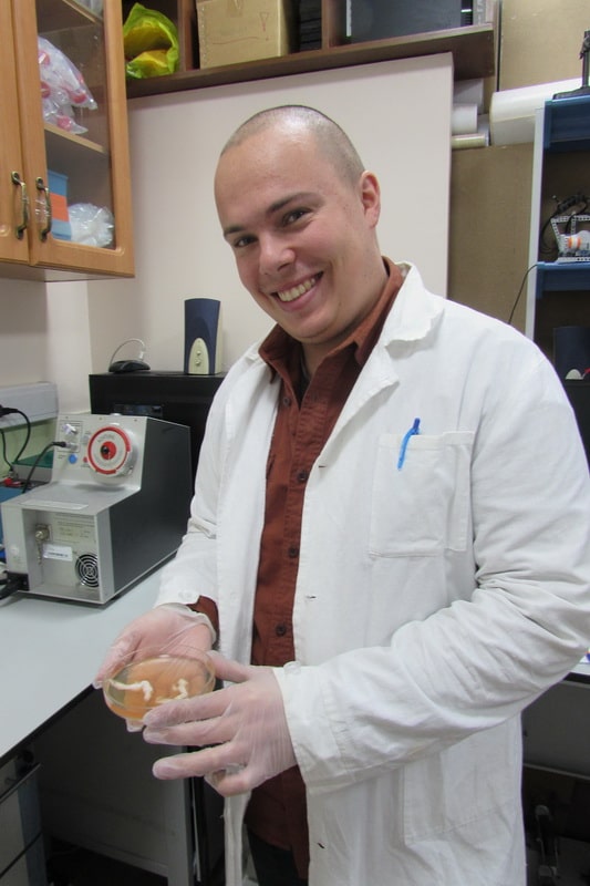Фото 1. Один из авторов работы — Дмитрий Ивлев — держит в руках чашку Петри с фибриновыми тромбами из экспериментальной системы. Предоставлено авторами исследования