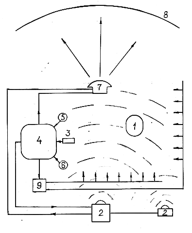 Микрофон 3 улавливает акустические сигналы и в электрическом виде передаёт их на ЭВМ 4, в оперативной памяти которой имеется программа преобразования акустических сигналов в электрические, которые, с учётом управляющих программ от задатчика 5 и датчика 6 параметров окружающей среды (помещения), формируют в оптическом преобразователе 7 видимое изображение в виде картинки на дисплее, в телевизоре и т.д., которое оптическими системами передаётся на большой экран 8 (им может быть потолок, стена, другой искусственный или природный объект – здание, обрыв, облако и т.п.).