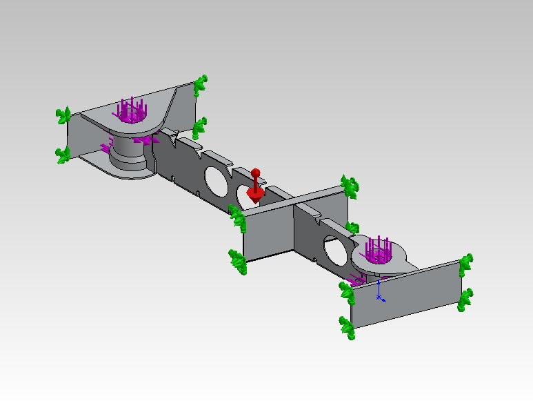 Расчетная схема с приложенными нагрузками и ограничениями, построенная согласно сборочных чертежей, представлена на рисунке 1.