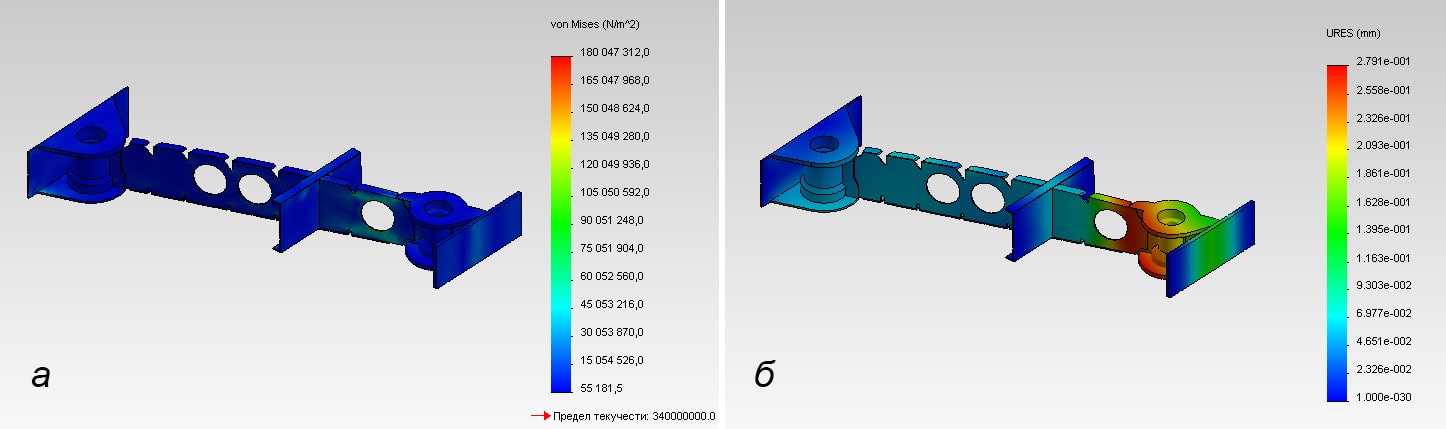 В компьютерном комплексе инженерного проектирования проведен статический анализ для определения напряжений, смещений, нагрузок и запаса прочности для компонентов с линейным материалом. Распределение напряжений и смещений по узлам представлено на рисунке 3.