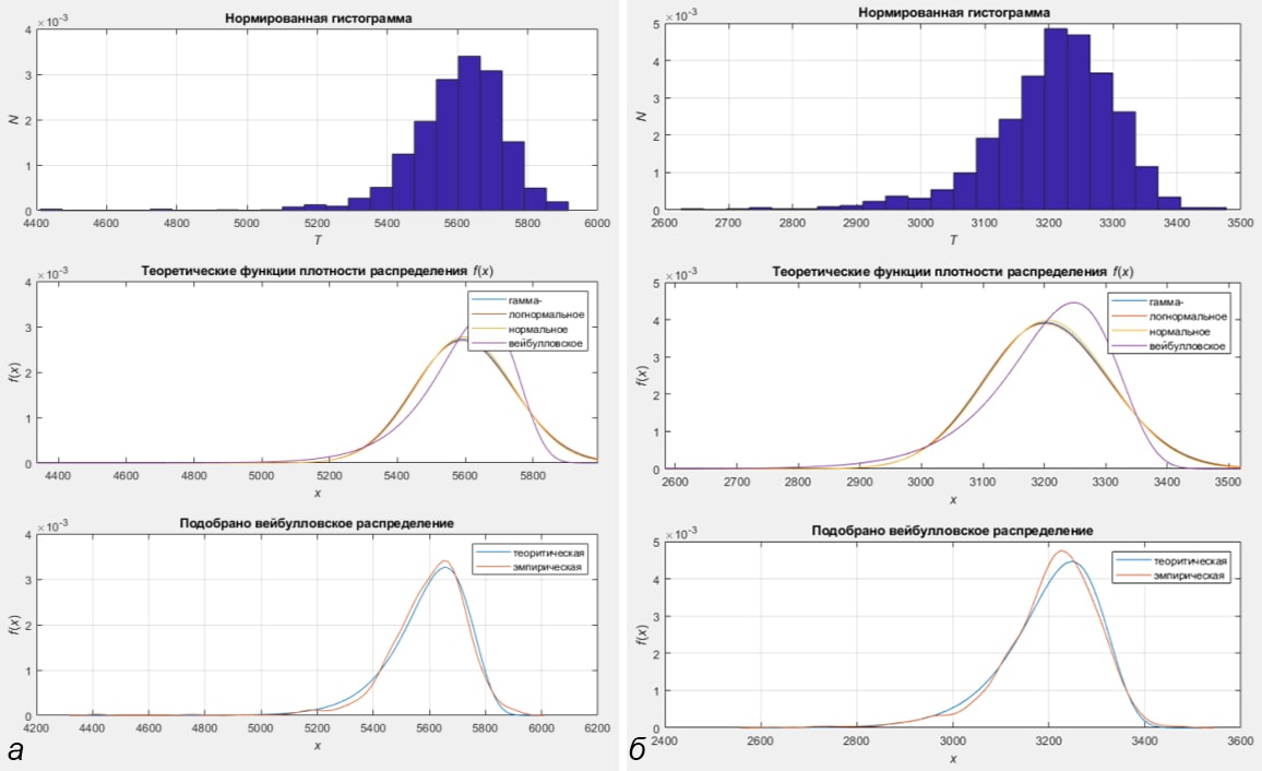 при штатной эксплуатации ЛА минимальный ресурс составил 4410 л.ч., средний ресур составил 5597 л.ч., максимальный 5915 л.ч. при ресурсе всего планера не менее 2500 часов, что хорошо согласуется с данными эксплуатации реальных ЛА. При этом подобрано вейбуловское распределение значения ресурса до предельного состояния с параметрами а = 5658,4; b = 50,11 (рисунок 5а).