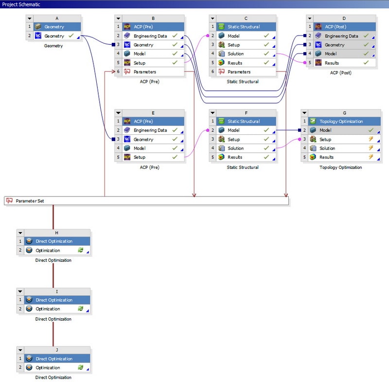 Структура проекта изображена на Рисунок 3. Блок «A» отвечает за построение геометрии. Блок «B» осуществляет построение конечно-элементной сетки и создает имитационную модель слоистой композиционной структуры. Блок «С» реализует решение конечно-элементной задачи. Блок «D» выполняет визуальную пост-обработку результатов. Блоки «E» и «F» являются копиями блоков «B» и «С», соответственно, с добавлением твердотельной композиционной структурой. Твердотельная модель в дальнейшем используется в блоке «G» для структурной оптимизации. Данные три блока дополнительно служат верификационным расчет, полученных данных при параметрической оптимизации. Блоки «H», «I» и «J» являются модулями оптимизации параметров композиционной конструкции. Каждый из блоков служит для определенной итерации оптимизации, таким образом удается обойти ситуацию, когда толщина слоев может равняться нулю.
