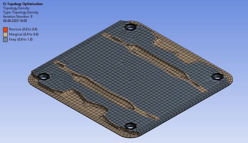 Результаты топологической оптимизации представлены на Рисунок . Итоговая масса составила 0,0294 кг.