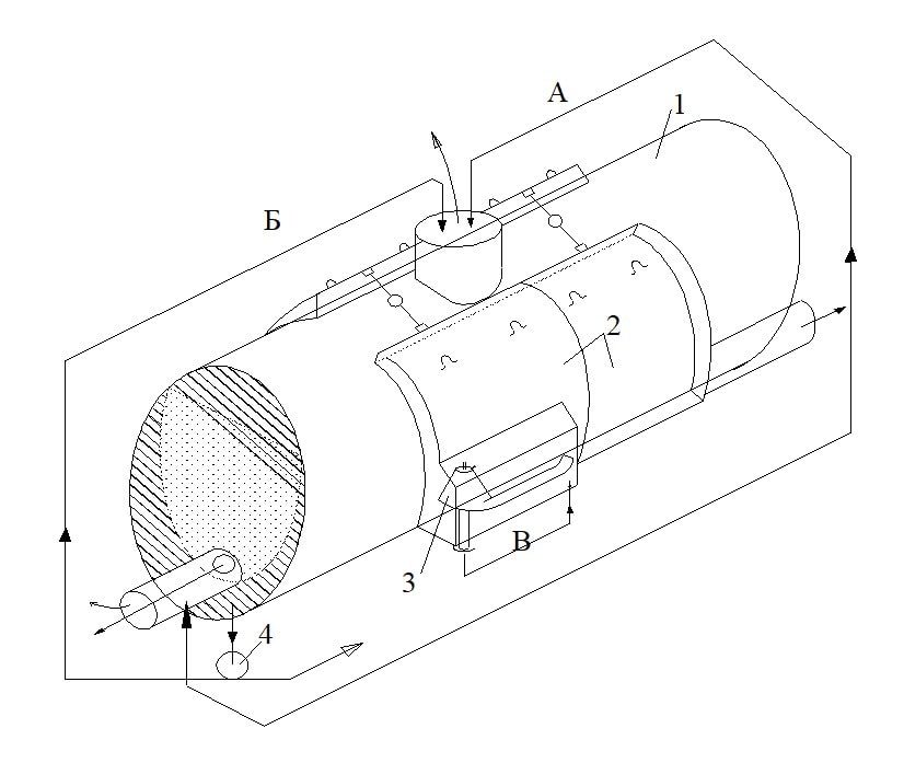 На цистерне 1 сверху-сбоку располагаются накладные нагреватели 2. Они представляют собой изогнутые коробчатые конструкции, по форме соответствующие цилиндру цистерны. Нагреватели изготовлены из листового металла толщиной 2-4 мм, ширина (между наружной и внутренней изогнутой поверхности) – 300 мм, длина (вдоль оси цистерны) – 2 м. Снаружи – теплоизоляция. Таких коробов может быть несколько, они соединяются отверстиями в боковых стенках (могут быть стяжки или фланцы). В нижней части монтируется КПГ-3. Она состоит из форсунки, пусковой электросвечи, камеры воспламенения, резонансной трубы, аэродинамического воздушного клапан (здесь – направлен вниз). Крепления и фиксация накладных нагревателей обусловлены конкретными заказчиками. Нагреватели устанавливаются при помощи своих подъемников простейшего типа, которые должны быть удобными и надежными.